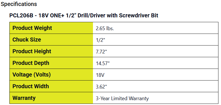 - (1) PCL206B – 18V ONE+ 1/2″ Drill/Driver with Screwdriver Bit
